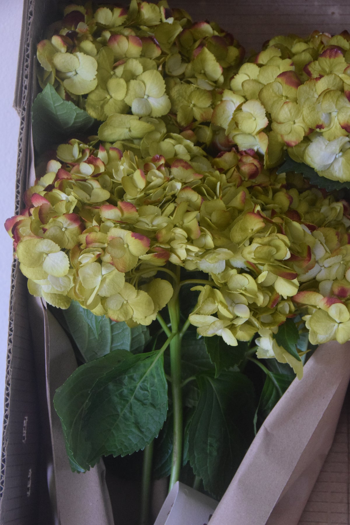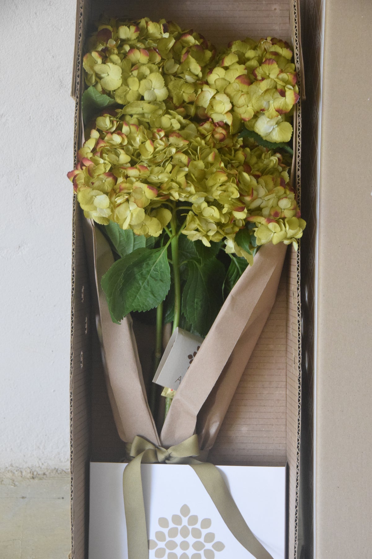 Nuestras hortensias, con copas de 19 a 20 cm de diámetro, son seleccionadas cuidadosamente por su frescura, volumen y riqueza de matices. Cada caja se presenta con un elegante lazo que resalta la intensidad y contraste de los tonos otoñales de esta edición especial.