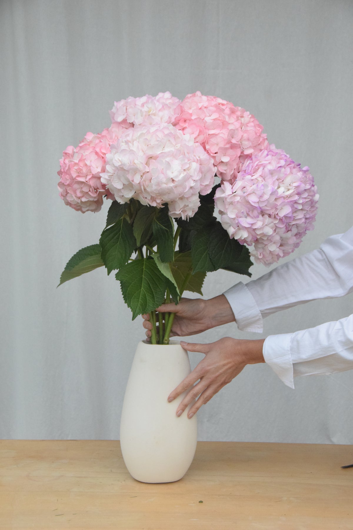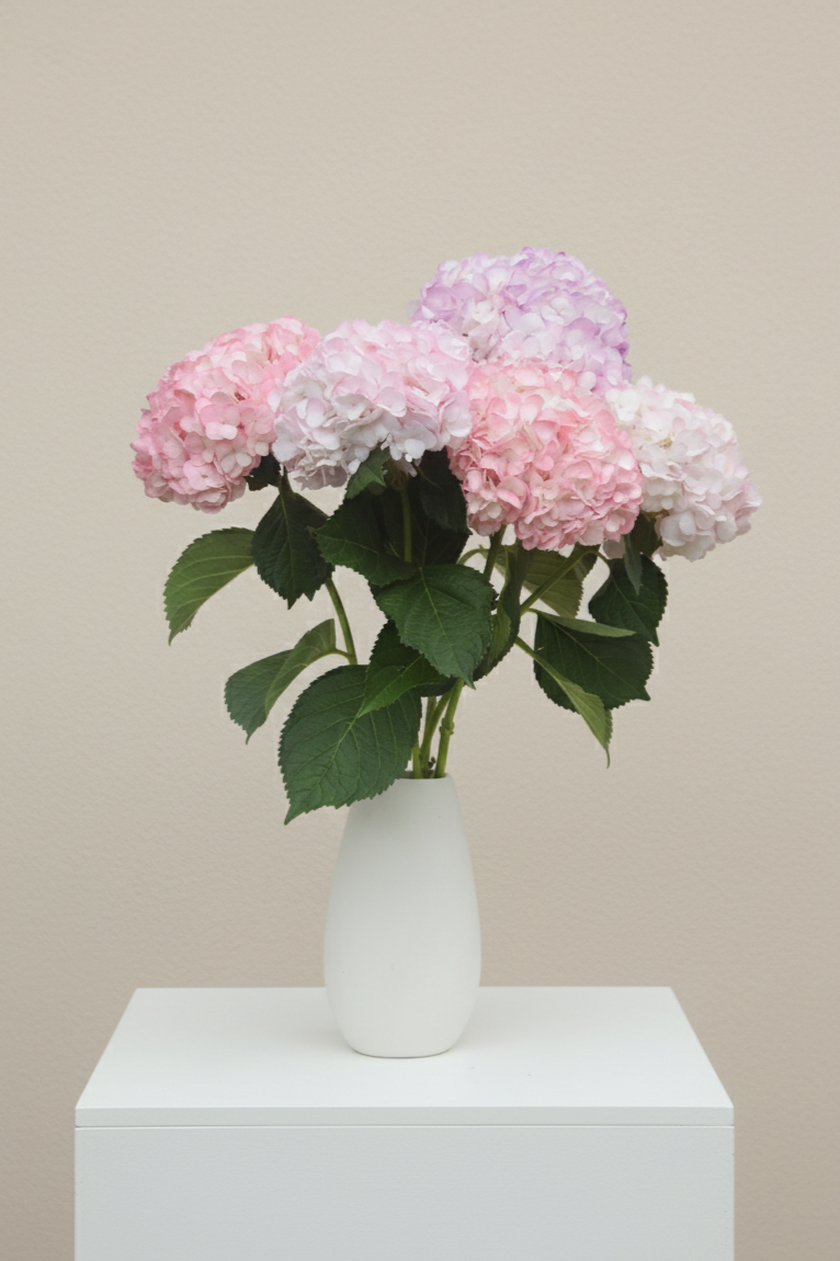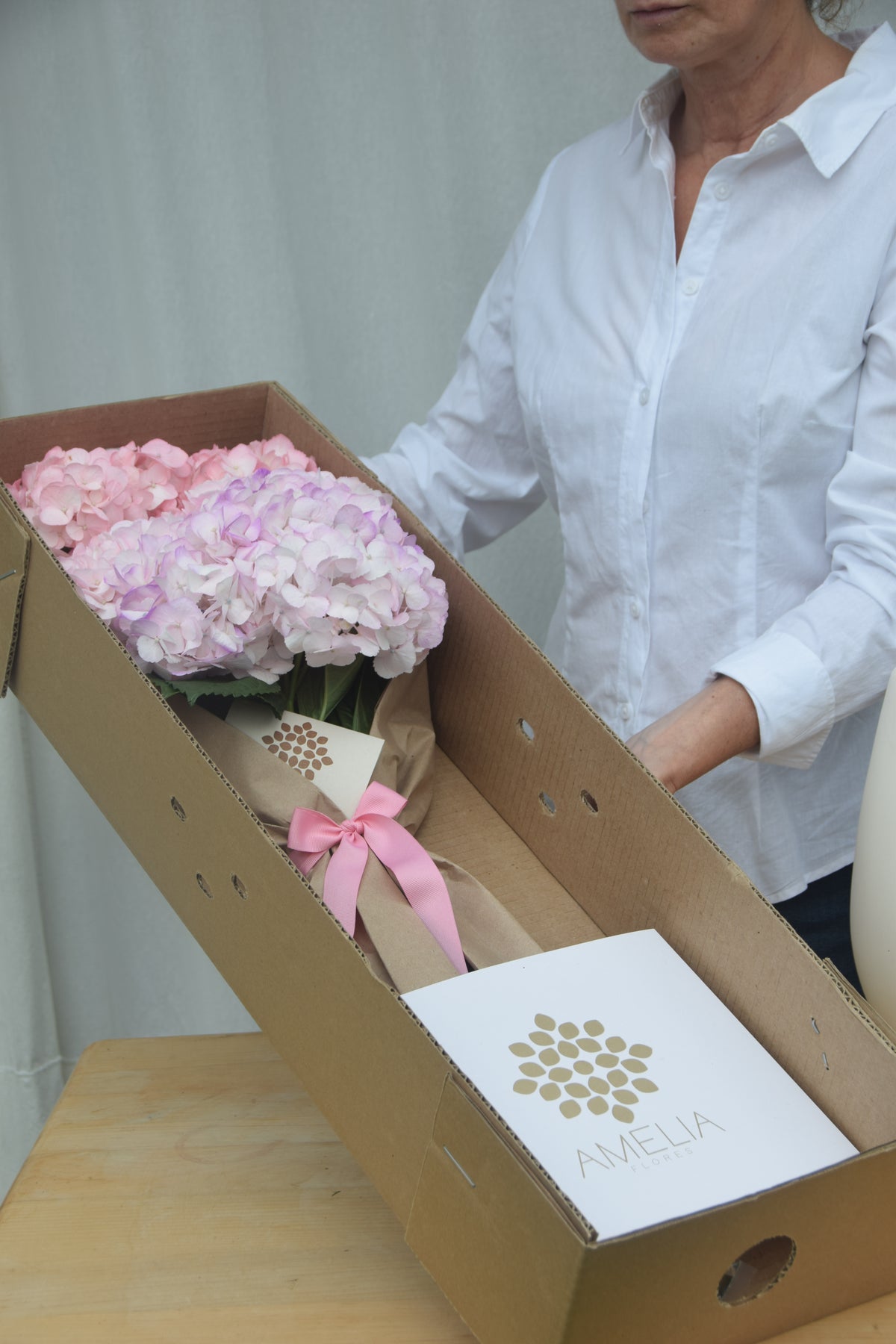 Nuestras hortensias, con copas de 19 a 20 cm de diámetro, son seleccionadas cuidadosamente por su calidad y belleza. Cada caja se presenta con un elegante lazo rosa que resalta la delicadeza y fuerza de esta edición conmemorativa.